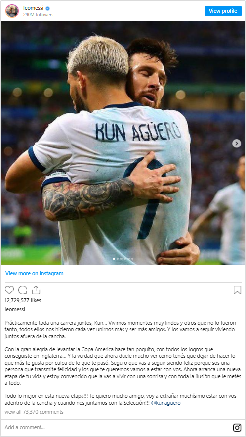 [아게로 은퇴에 찐슬픔이 느껴지는 메시의 인스타]