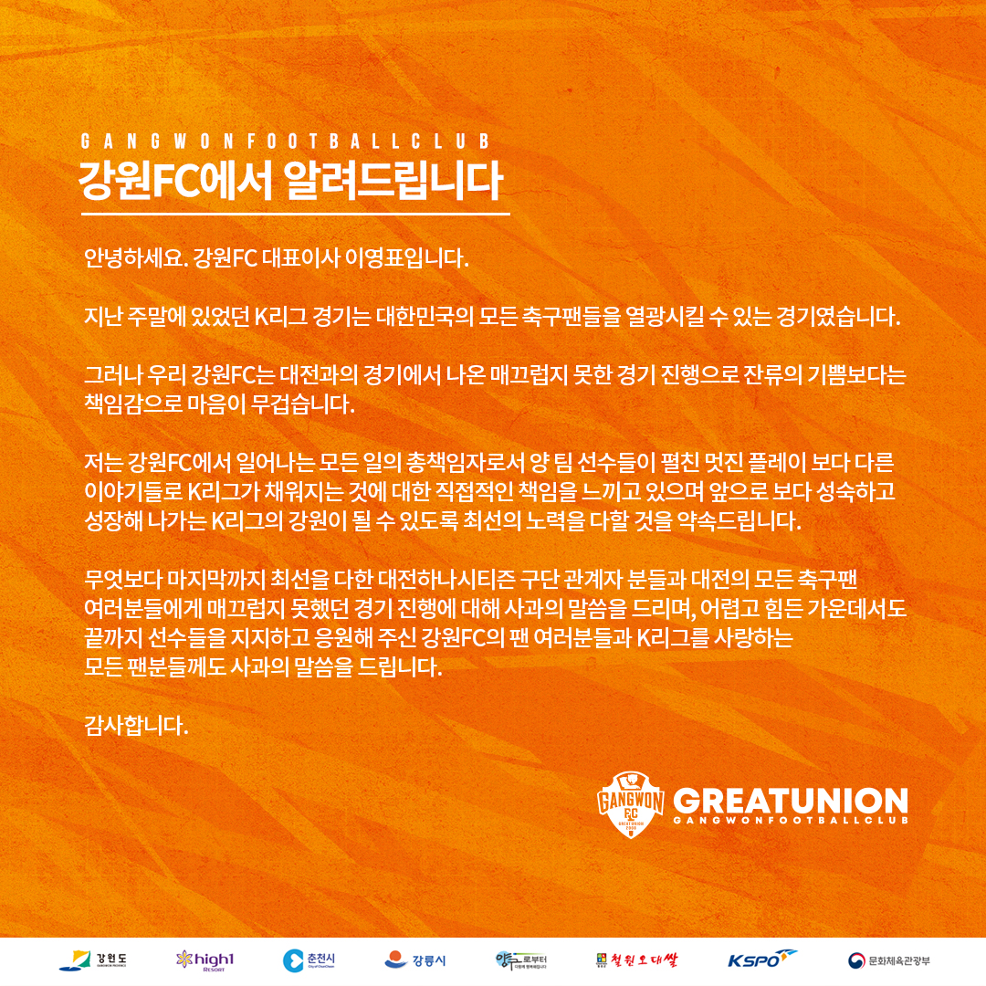 [오늘 올라온 강원 FC 이영표 대표이사의 공식 사과문]