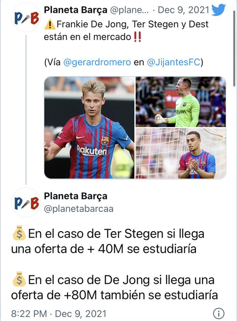 [제라르 로메로] - 이적시장에 프랭키 데용, 데스트,테어슈테겐을 등록한 바르셀로나. 테어슈테겐은 40m, 프랭키 데용은 80m 이상 오퍼가 온다면 팔 수 있음.