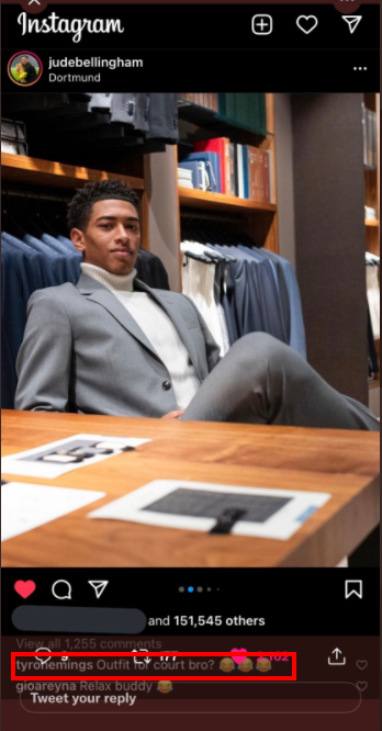 정장을 입은 사진을 게시한 벨링엄에게 드립 날리는 타이론 밍스ㅋㅋㅋㅋㅋ