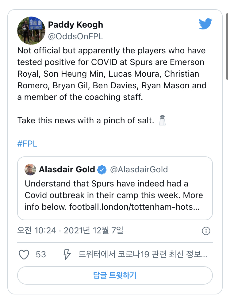 파디 키옥의 소식에 따르면 오피셜은 아니지만 토트넘에서 코로나를 걸린 선수는 에메르송, 손흥민, 모우라, 로메로,힐,BD33이 확진되었다고 하네요.. 하지만 이성모 기자님의 소식에 따르면 현재 코로나 양성 반응은 간이 검사에서 양성이 나온것이고 PCR 검사에서 양성이 나온것은 아니라고 합니다. 이전에도 1차에서 양성 2차에서 음성이 나온 사례가 있었고 현재 확진자 수는 최대 6명의 선수 +2명의 스텝으로 정확히 어떤선수와 스탭인지는 불투명하다고 합니다. 파디 키옥이 어떠한 경로를 통해 선수들의 실명을 들었다 하더라도 구단 공식 컨펌이 아니기 때문에 공식적인 결과를 기다려봐야 할 것 같다고 합니다.