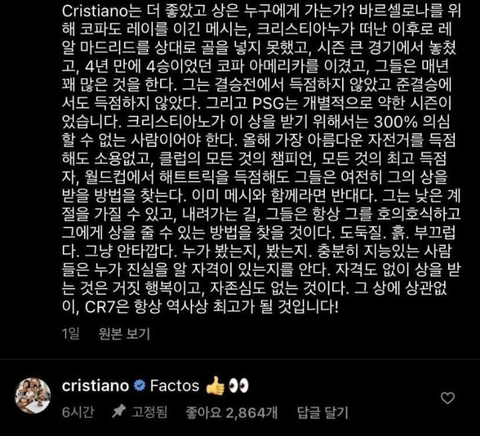 [터질게 터진 호날두의 메시 저격 인스타 'Factos']