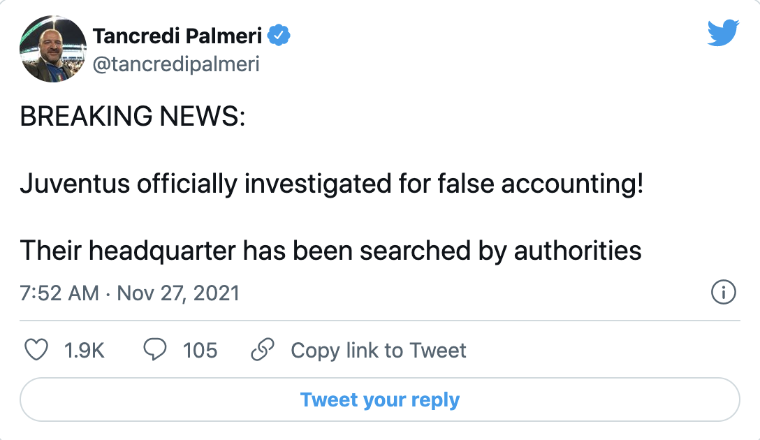 팔메리 속보 - 현재 유벤투스는 회계 조작 논란으로 공식 조사를 받고 있다. 유벤투스는 당국에 의해 수색중이다. 와.... 사실이라면 논란이 크겠는데요??ㄷㄷㄷㄷㄷ