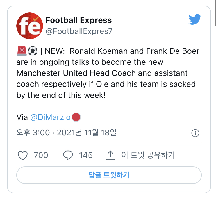 [[디마르지오] 쿠만과 데부어는 맨유의 감독과 수석코치를 놓고 회담중]