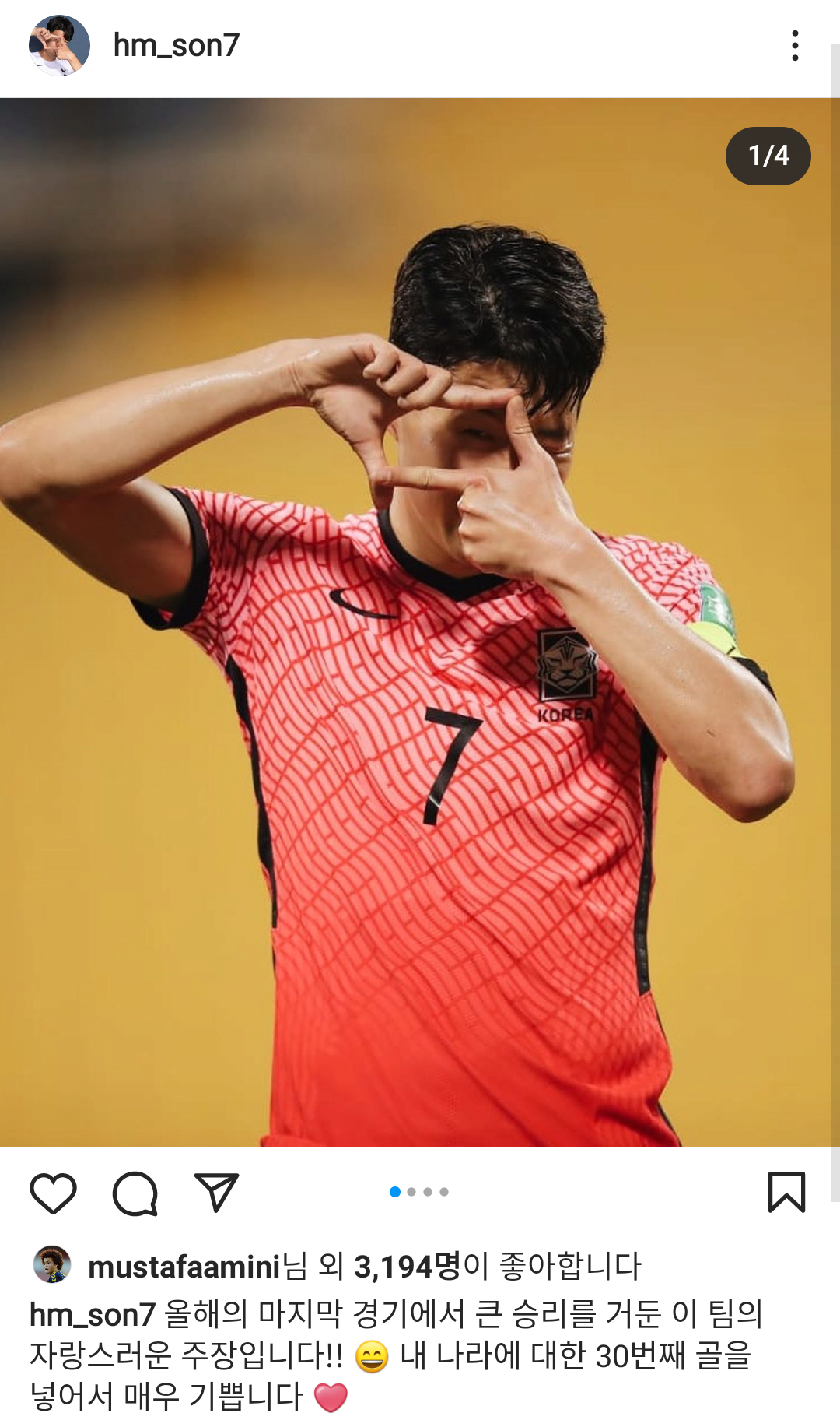- 경기 후 손흥민 선수 인스타