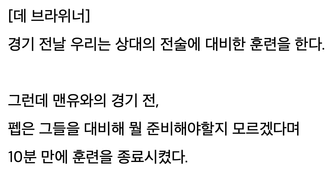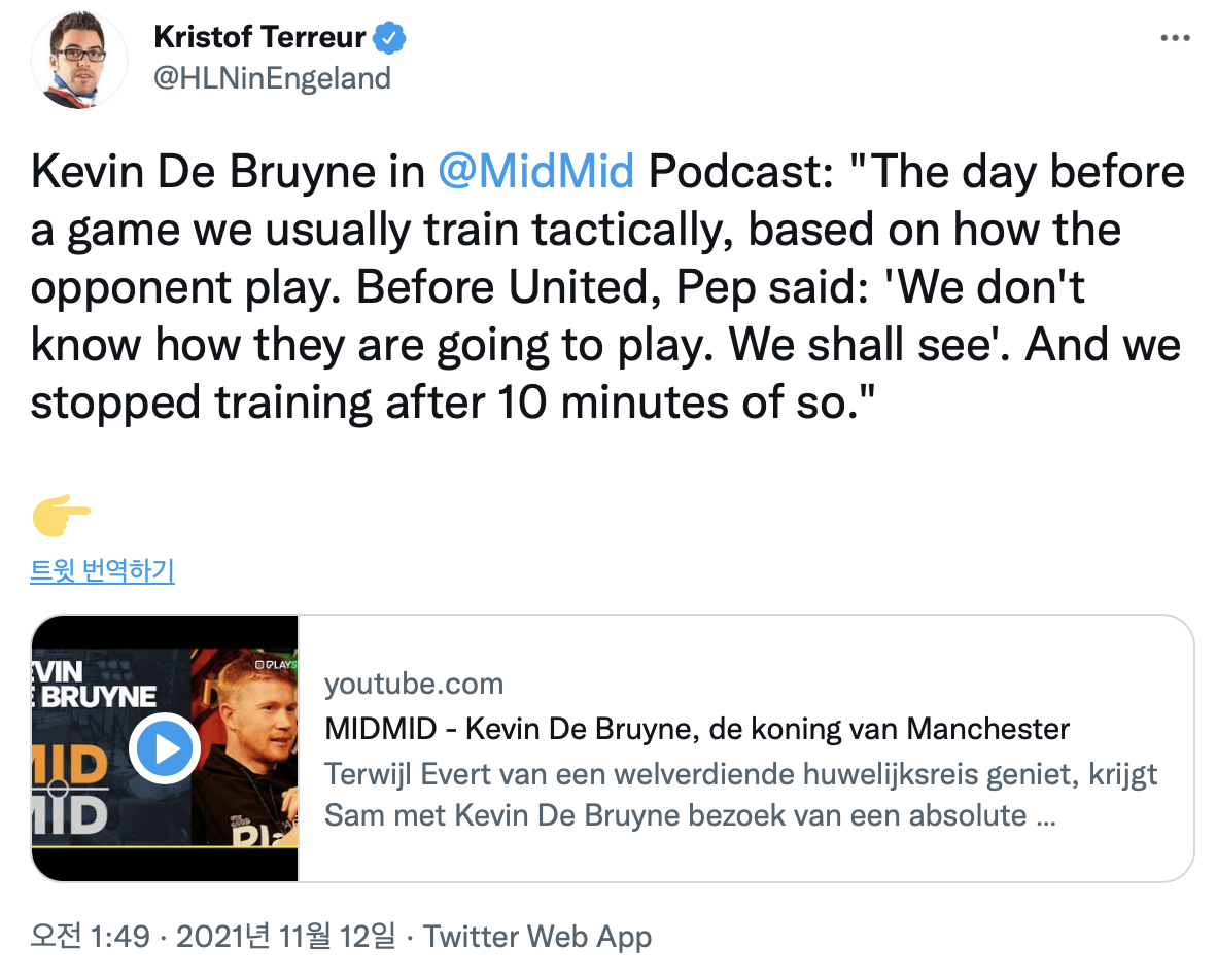 [데 브라위너 "맨유전 대비 훈련은 10분 만에 끝났다"]