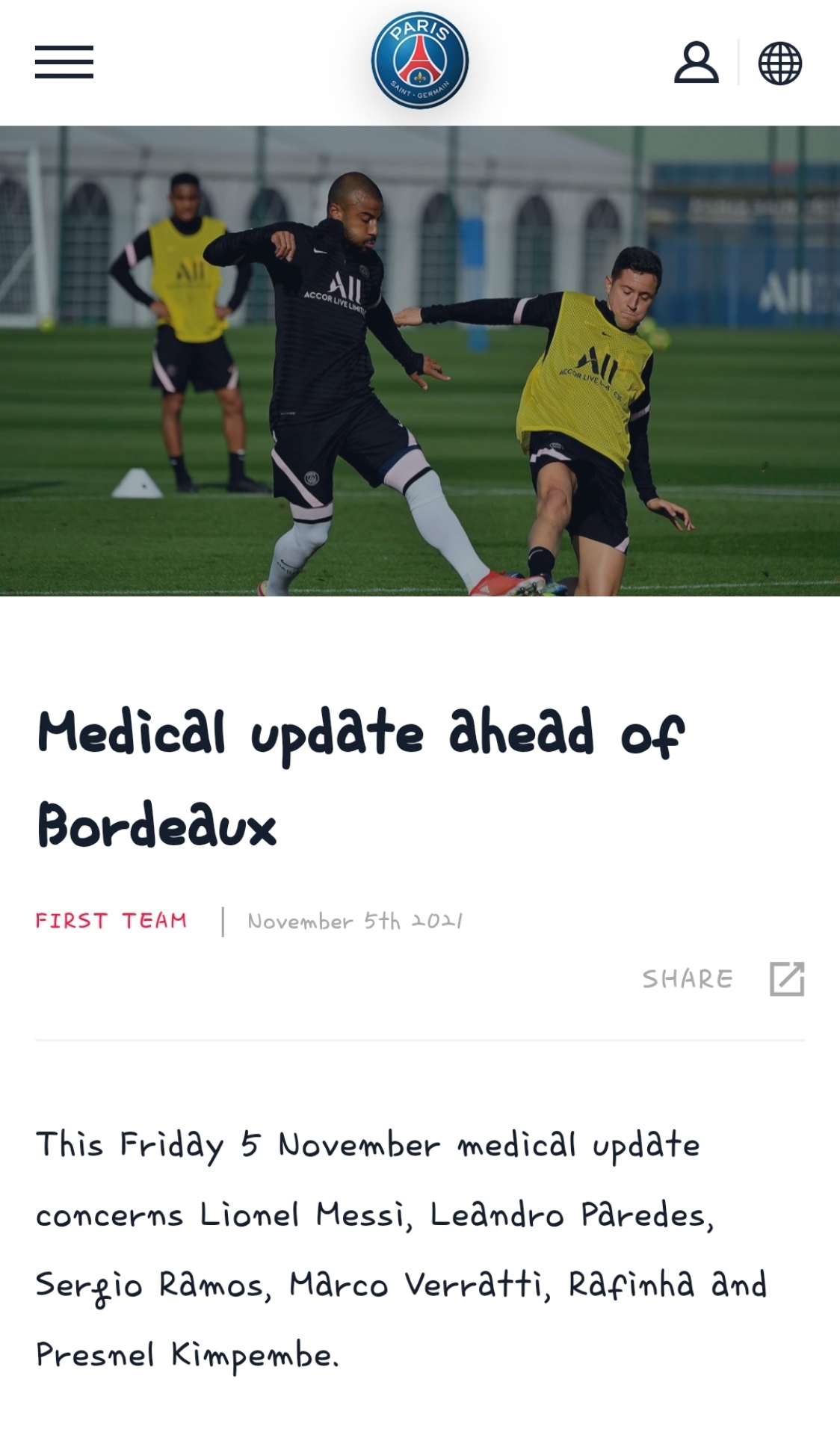공식 홈페이지 : https://en.psg.fr/teams/first-team/content/medical-update-lionel-messi-leandro-paredes-sergio-ramos-marco-verratti-rafinha-presnel-kimpembe-fc-girondins-de-bordeaux-paris-saint-germain-ligue-1-2021-2022