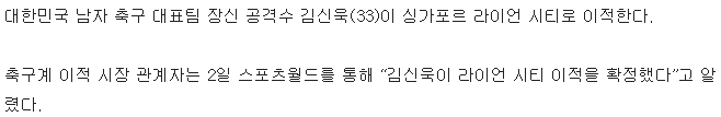 [FA김신욱의 선택은 K리그가 아닌 라이언시티]