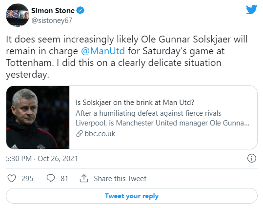 사이먼 스톤 - 토트넘과의 경기에서 솔샤르가 감독직을 이어갈 가능성이 높아보인다.