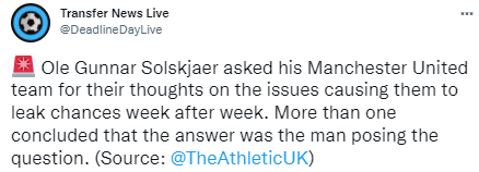 솔샤르는 팀에게 매주마다 찬스를 놓치는 문제를 어떻게 생각하냐고 물었다. 팀에는 그 질문을 한 사람(솔샤르)에게 원인이 있다고 생각하는 사람들이 많다.