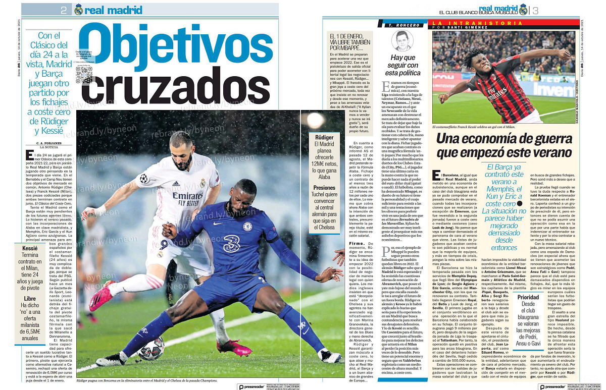 레알 마드리드는 알라바 작업을 반복할 계획이다. 첼시 수비수 뤼디거에게 연봉 12m 유로, 최소 3년 계약을 제시할 생각이다. 이는 알라바와 동일한 연봉이다. 뤼디거는 2022년 원하는 클럽과 합법적으로 협상할 생각으로 자신의 생각을 굳히고 있다. 영국 언론은 뤼디거가 첼시에게 실망스럽다고 보도했으며 마리나와 재계약 협상에서 큰 진전을 이루지 못했다.