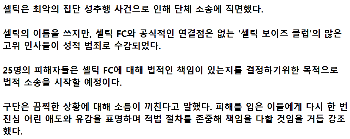 (기사 전문: https://www.skysports.com/football/news/11787/12426680/celtic-face-group-legal-action-over-historical-sexual-abuse-at-boys-club )
