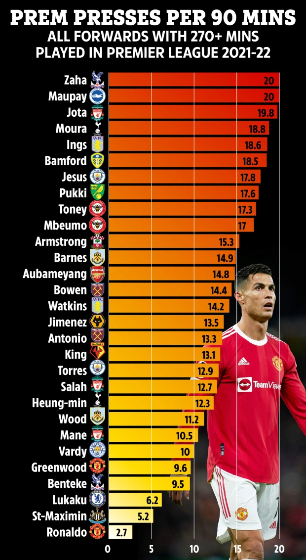 호날두는 PL 공격수 중에 가장 압박을 하지 않는 선수다