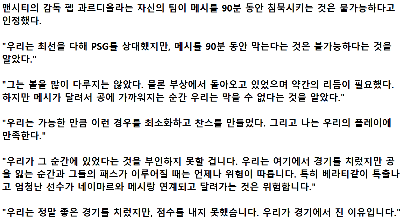 (기사 전문: https://www.skysports.com/football/news/11679/12420607/pep-guardiola-on-lionel-messi-impossible-for-man-city-to-control-paris-saint-germain-forward )