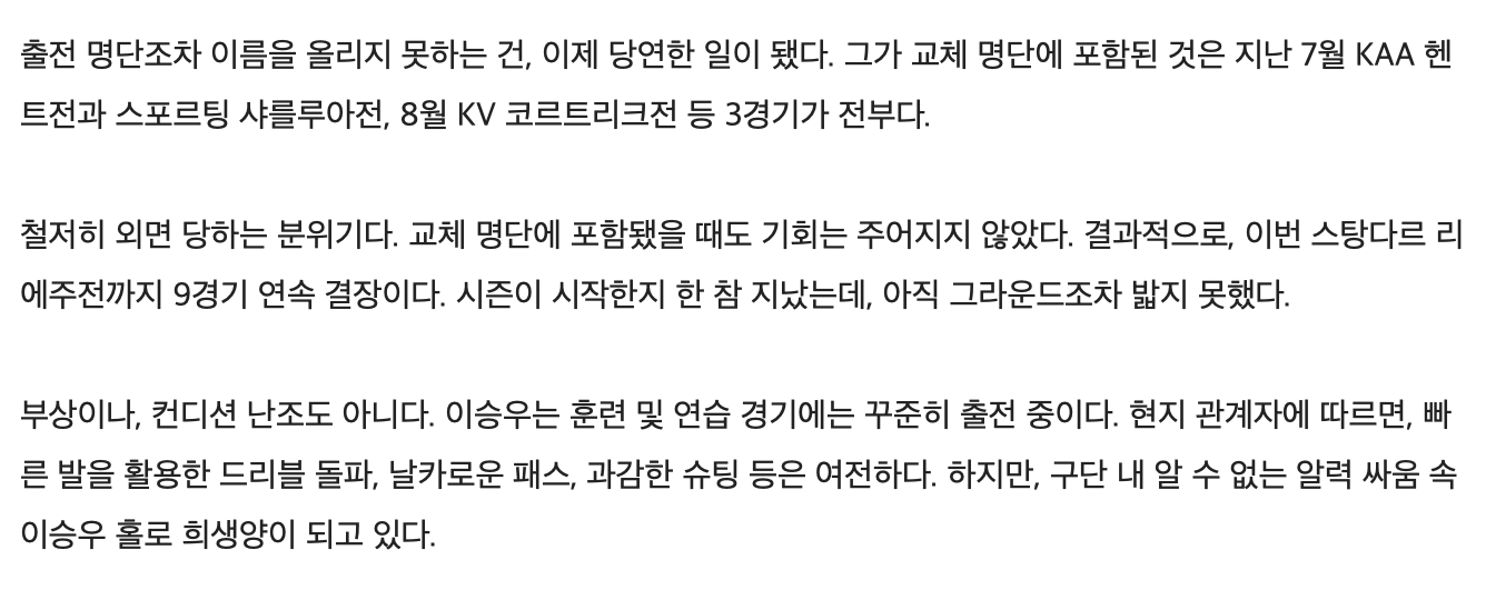[이승우, 9경기 연속 결장.. 구단 내 알력 싸움의 희생양]