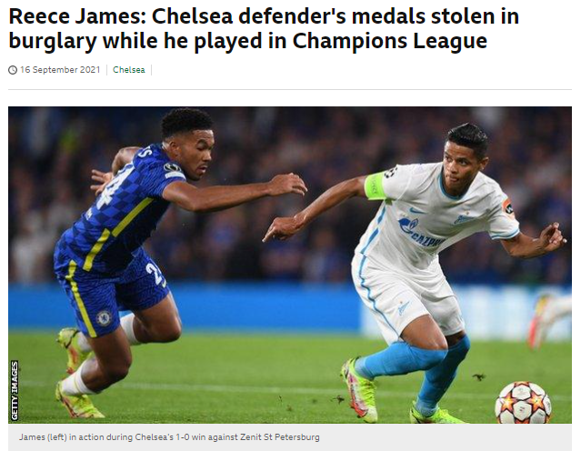 기사에 따르면 리스 제임스는 22일 챔피언스리그 제니트 상트페테르부르크와의 경기에서 첼시에서 뛰던 중 집에 도둑이 들었고 유로 2020 준우승 메달, 챔피언스 리그 우승 메달, 슈퍼컵 우승 메달을 도둑맞았다고 말했다. 그는 '참 운이 좋게도' 강도 사건 동안 아무도 그의 집에 없었다고 덧붙였다.