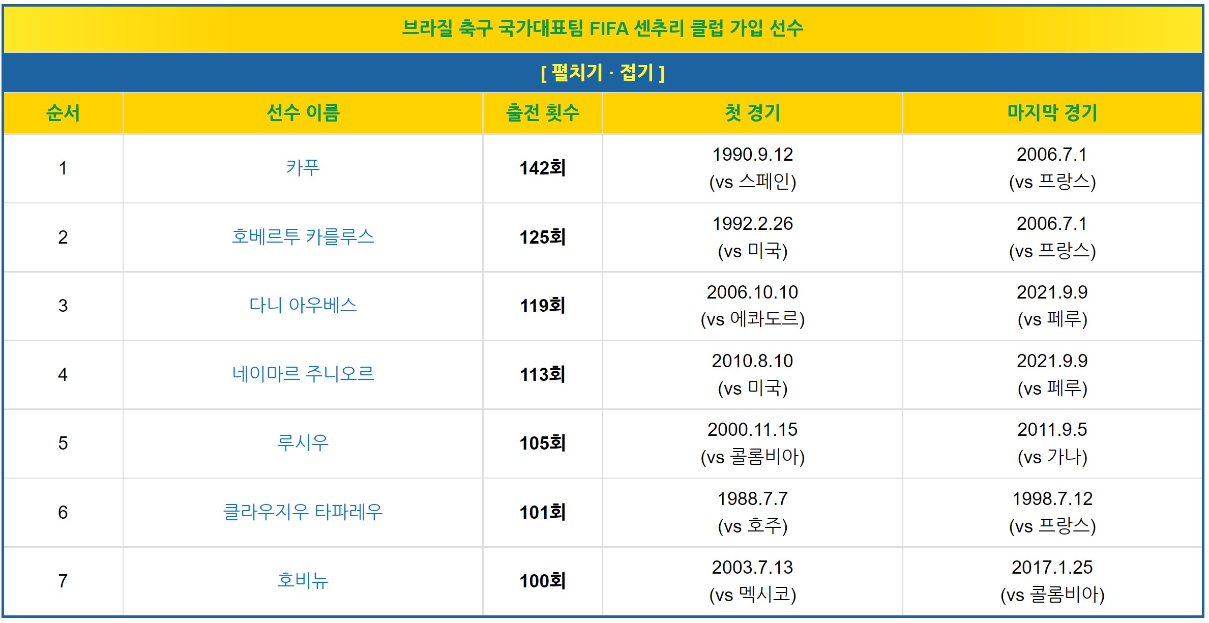 그 기록은 센추리클럽. 그 강한 브라질 대표팀에서 센추리클럽을 기록한 선수는 현재 7명 뿐이라고....