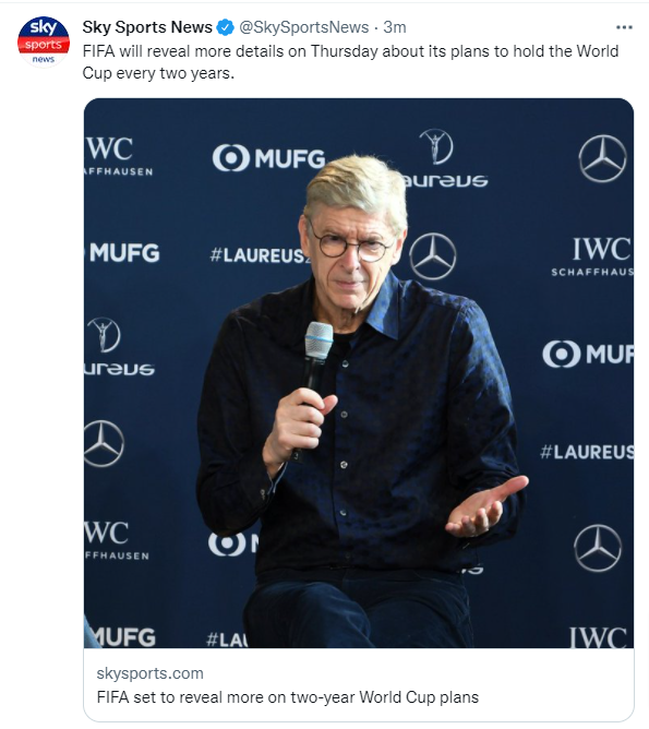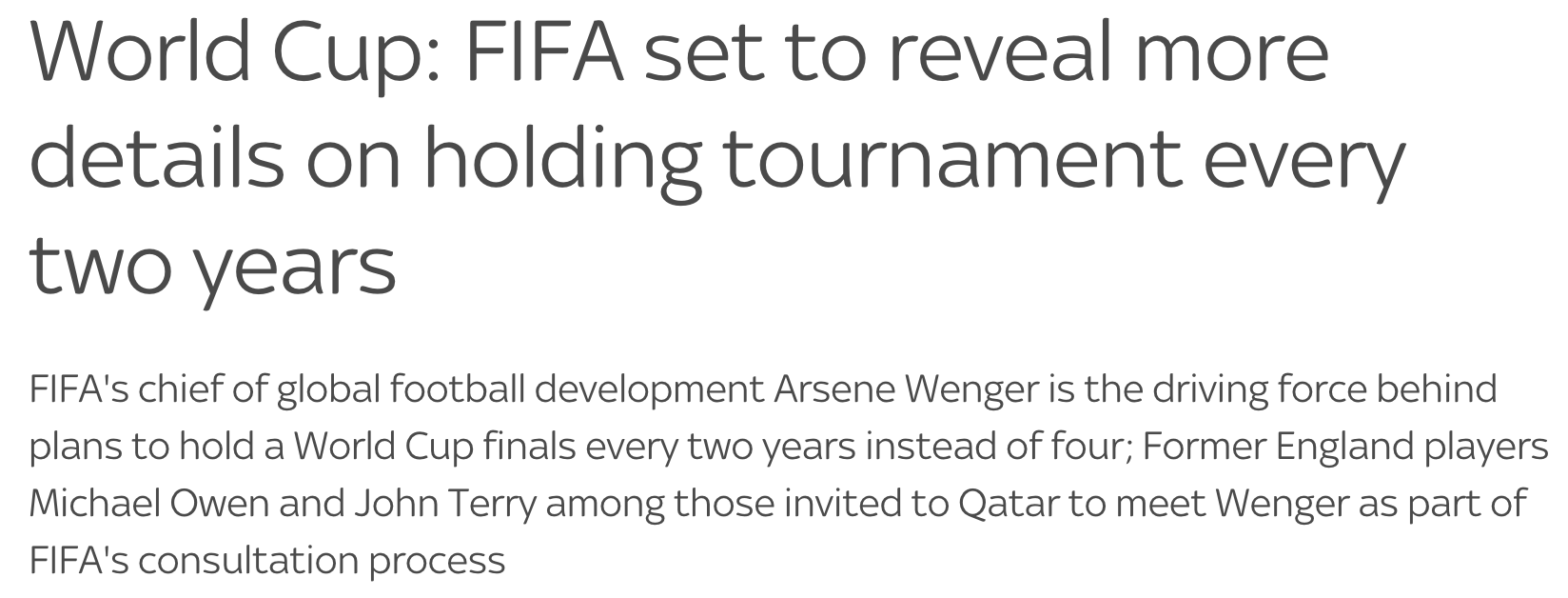 출처 : https://www.skysports.com/football/news/12040/12401829/world-cup-fifa-set-to-reveal-more-details-on-holding-tournament-every-two-years