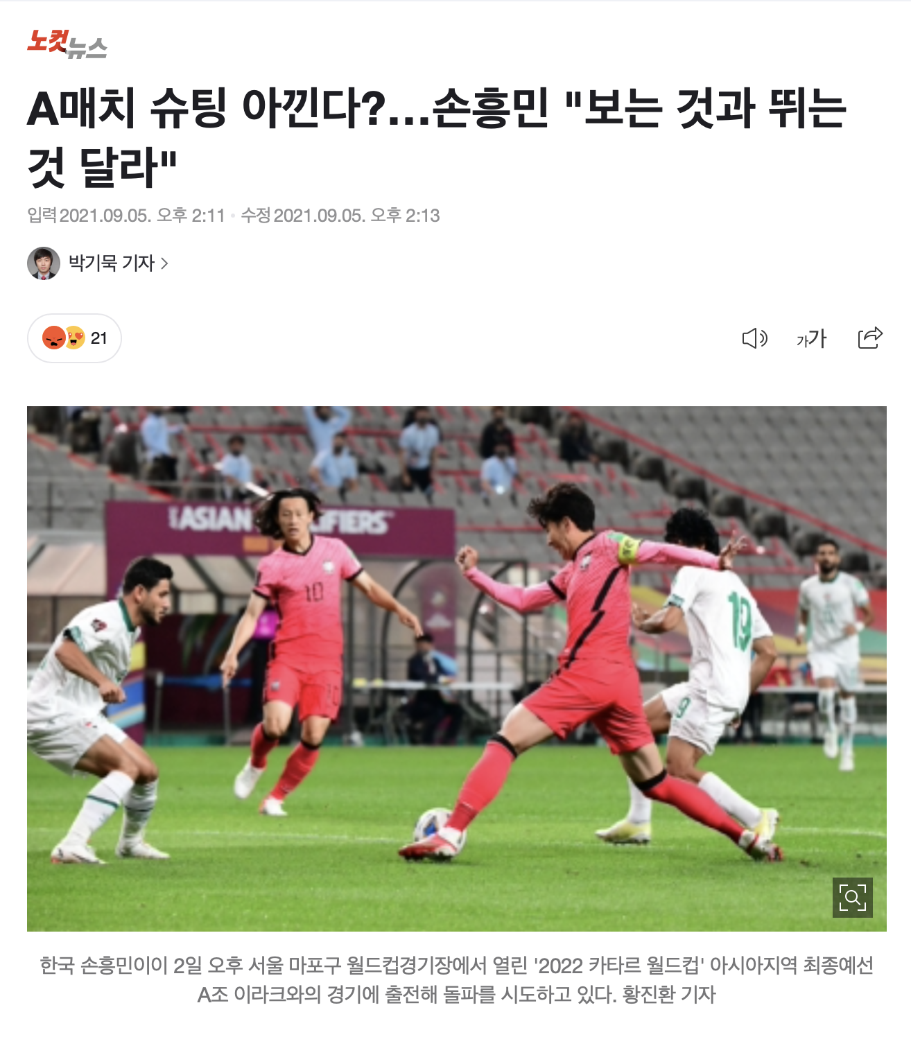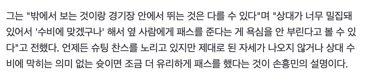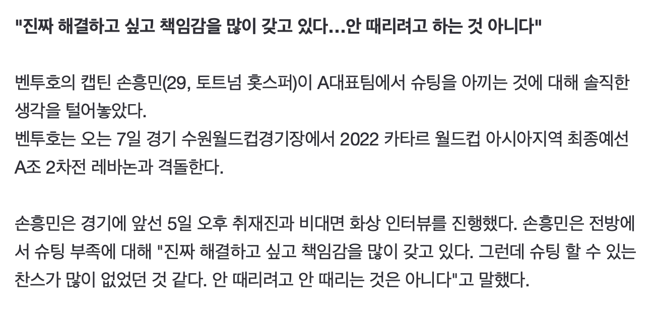 [손흥민 "국대에서 슈팅 일부러 아끼는 것 아니다"]