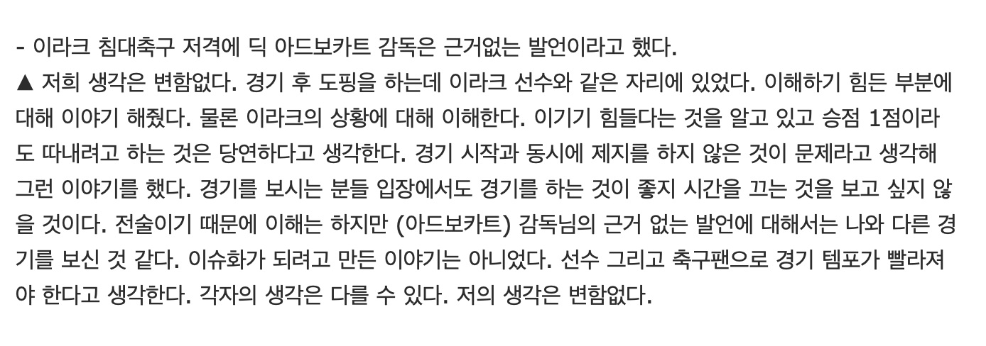 [손흥민 "이라크의 침대 축구.. 내 생각에 변함은 없다"]