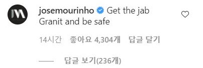 [자카 코로나 확진 후 무리뉴가 SNS에 남긴 댓글]