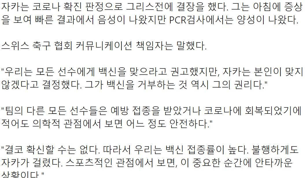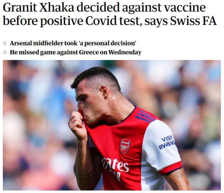 (기사 전문: https://www.theguardian.com/football/2021/sep/02/granit-xhaka-decided-against-vaccine-before-positive-covid-test-says-swiss-fa )