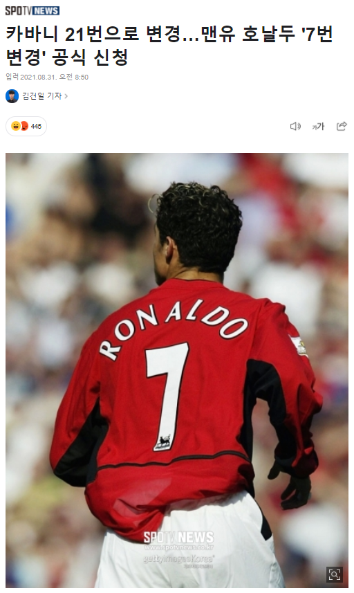| 카바니 21번 변경, 호날두 7번 공식 신청 | |