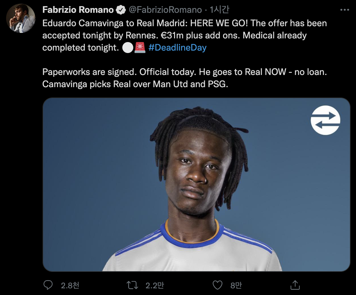 [[파브리지오 로마노] 레알 마드리드, 에두아르도 카바빙가 던딜]