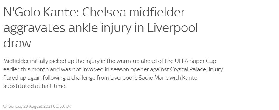 (기사 전문: https://www.skysports.com/football/news/11668/12394063/ngolo-kante-chelsea-midfielder-aggravates-ankle-injury-in-liverpool-draw )