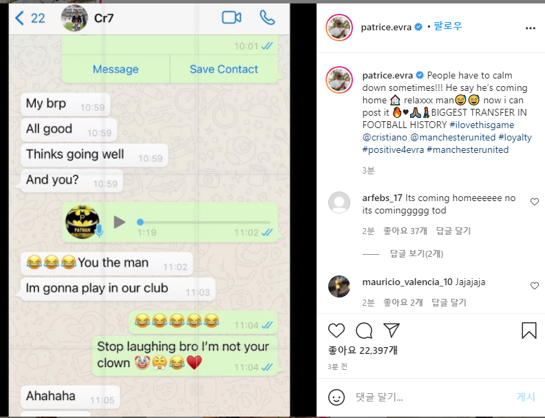 [호날두 이적전 에브라와 호날두의 대화 내용 유출]