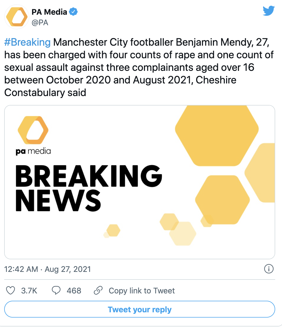 맨시티 소속의 벤자민 멘디는 16세 이상 여성 3명을 강간 4건 성폭행 1건 혐의로 기소