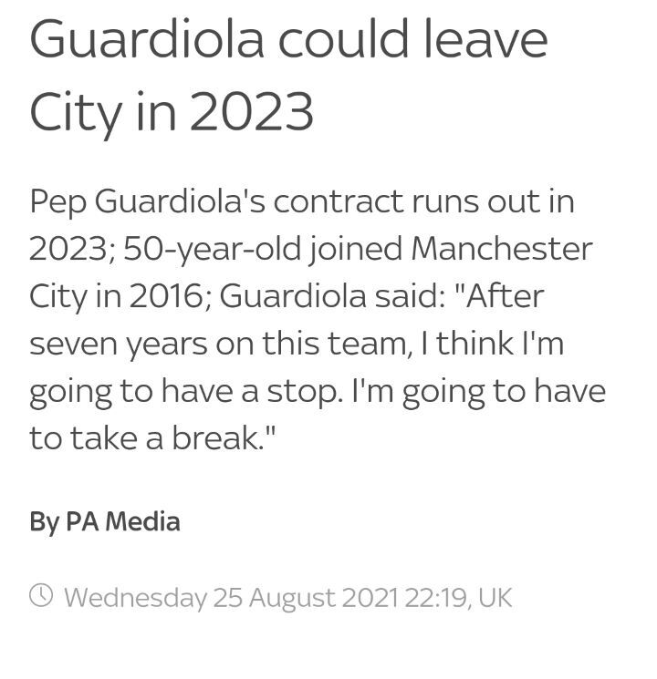 출처 : https://www.skysports.com/football/news/11679/12390719/pep-guardiola-suggests-he-could-leave-manchester-city-when-his-contract-expires-in-2023