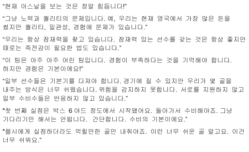 "재능과 경험의 차이가 눈에 보이고 있어요. 이건 정말 명백하군요. 첼시는 너무 많은 공간과 볼을 지배했습니다. 그들이 압도했어요.