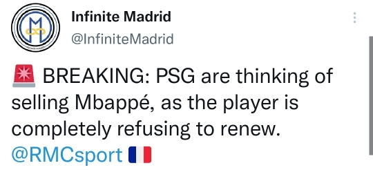 파리는 음바페 판매 고려중 음바페가 재계약 의지가 없는 것이 그 이유 익명의 잉글랜드 클럽 하나가 음바페 영입을 위해 접촉했었고 레알 마드리드는 상황을 지켜보고 있다 PSG는 음바페에 대한 제안을 들어볼것이며 레알은 제안을 준비중 PSG 측은 히샬리송측과 접촉했으며 PSG는 히샬리송을 음바페의 대체자로 생각중