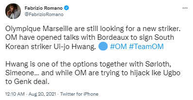 [[로마노] 마르세유, 황의조 영입위해 보르도와 협상 시작]