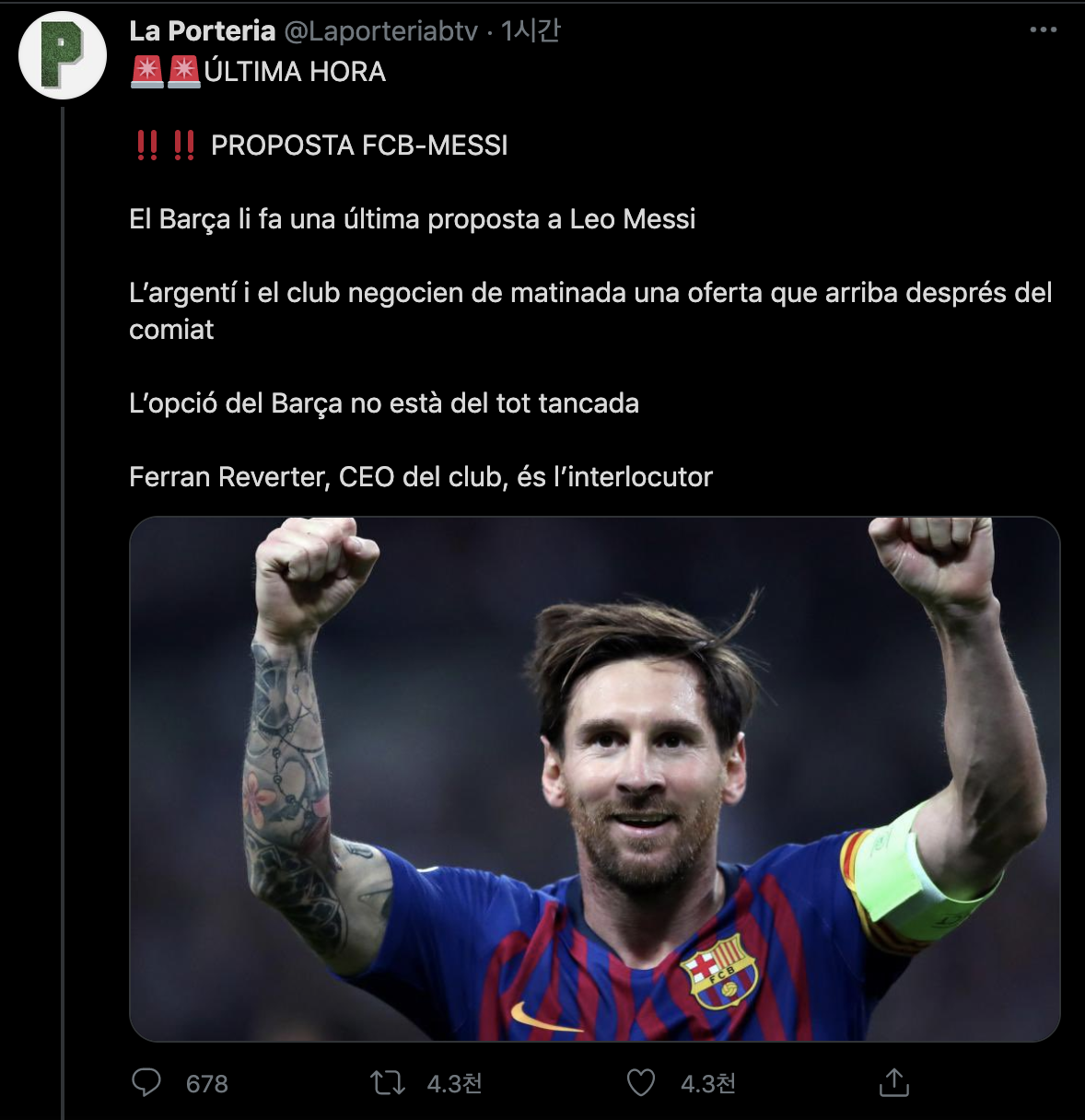 [[긴급 속보] 메시의 FC 바르셀로나 잔류는 아직 배제되지 않음.]