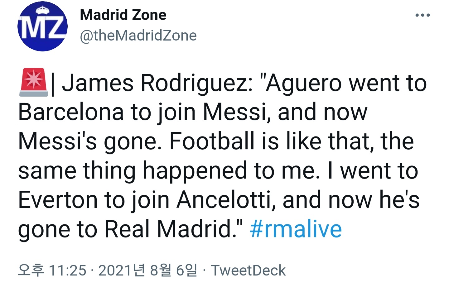 하메스 : "아구에로는 메시와 함께 뛰기 위해 바르셀로나로 갔지만 메시는 떠났다. 축구란 그런 것이다"