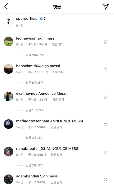토트넘 - 메시를 원하는 댓글들ㅋㅋㅋㅋ