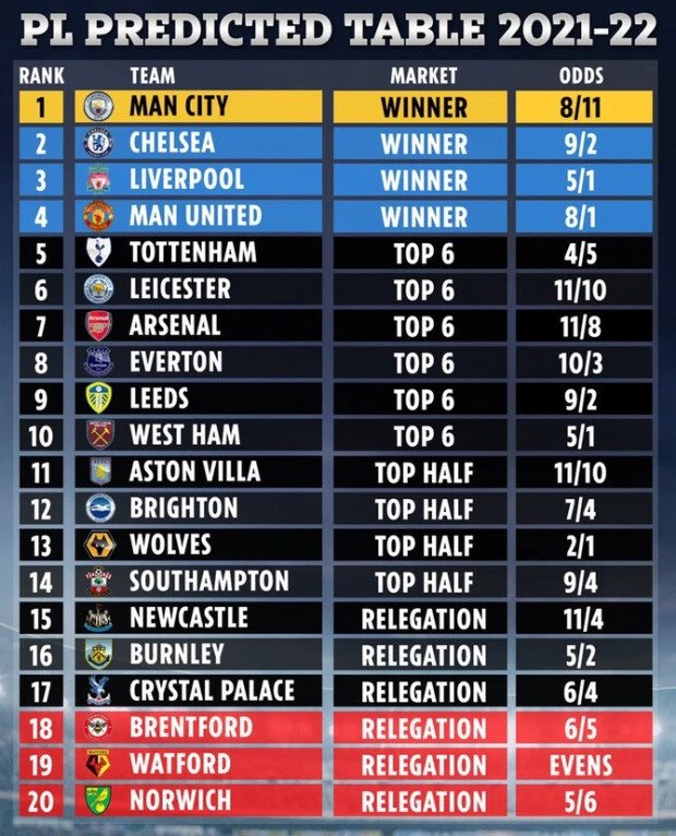 또한 지난 시즌에 2위를 달성한 맨유는 제이든 산초와 라파엘 바란을 영입했음에도 불구하고 4위를 차지할 것이라고 예측했습니다.