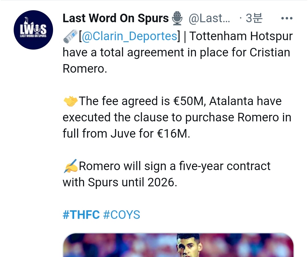 (Clarín Deportes) 크리스티안 로메로 토트넘과 계약함 2026년 5년계약 이적료 유로50m
