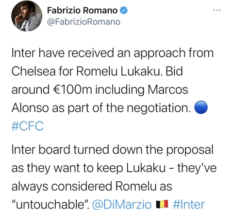 [파브리지오 로마노] 첼시, 루카쿠 영입 위해 €100m + 마르코스 알론소 오퍼