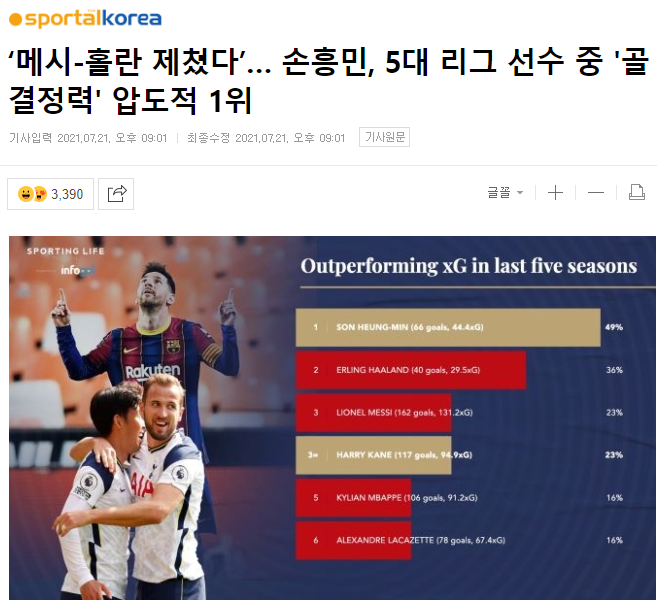 손흥민이 5대 리그 선수들 중 메시, 홀란드를 제치고 압도적 수치로 xG 값 1위를 차지했다.