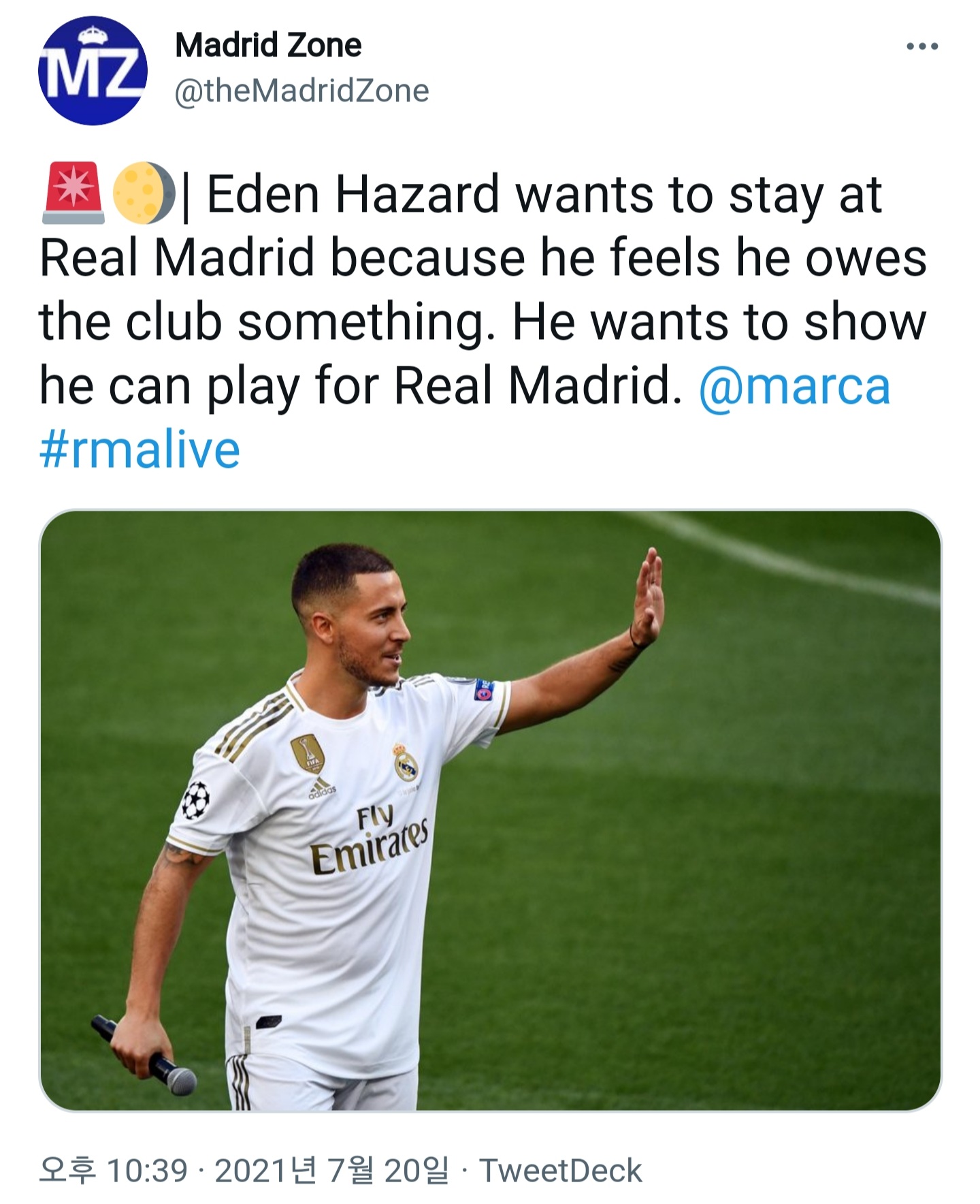 구단에 빚을 지고 있다고 생각하고 있기 때문이라고....레알에서 뛸 수 있다는 것을 보여주고 싶어한다는 아자르