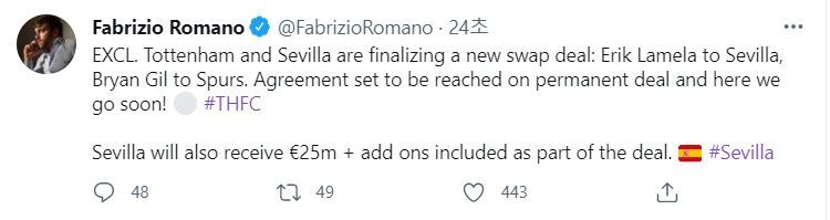 에릭 라멜라 세비야행, 브라이언 힐 토트넘행 ,세비야는 25m 유로 +@도 받을 예정