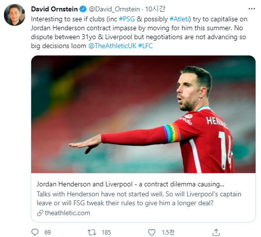 온스테인 - 파리 생제르망과 아틀레티코는 헨더슨과 리버풀의 교착 상태를 이용해 이번 여름에 그를 영입하고자 할수 있으며 헨더슨과 리버풀 사이에 논쟁은 없지만 협상이 진전되지 않고 있다