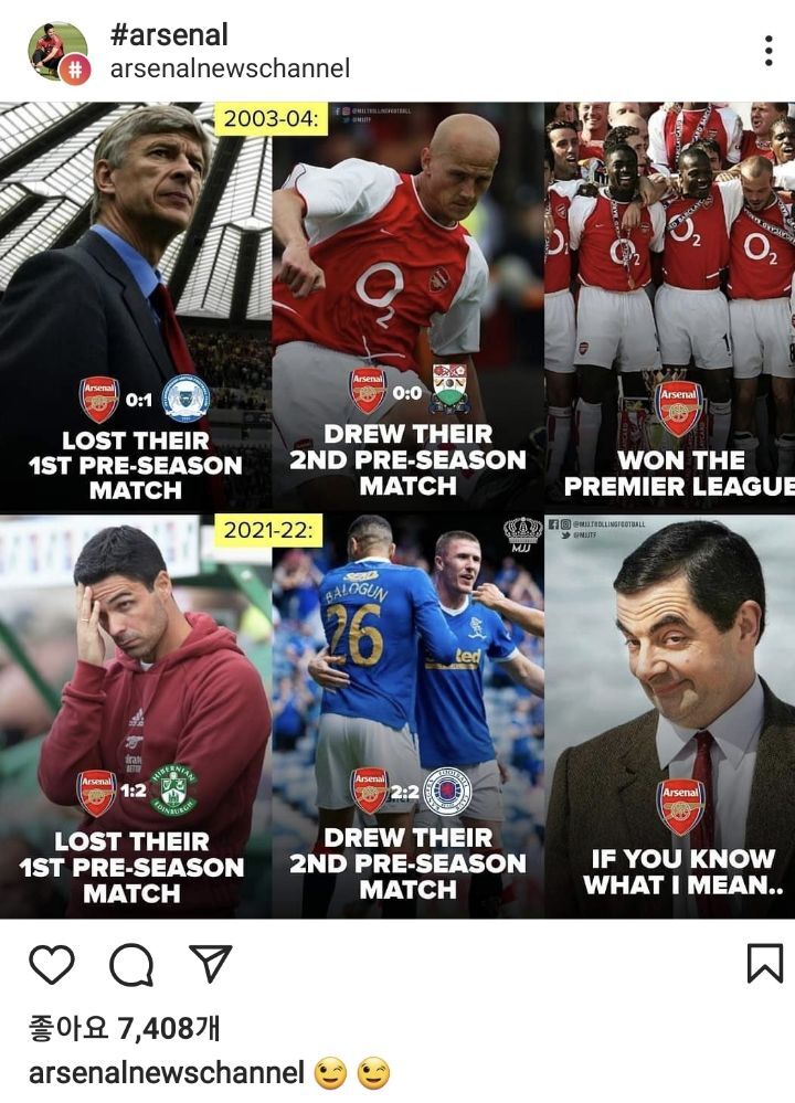 프리시즌 두경기로 무패우승 시즌이랑 평행이론 행복회로 돌리는 어느 아스날 팬 ㅋㅋㅋㅋㅋ