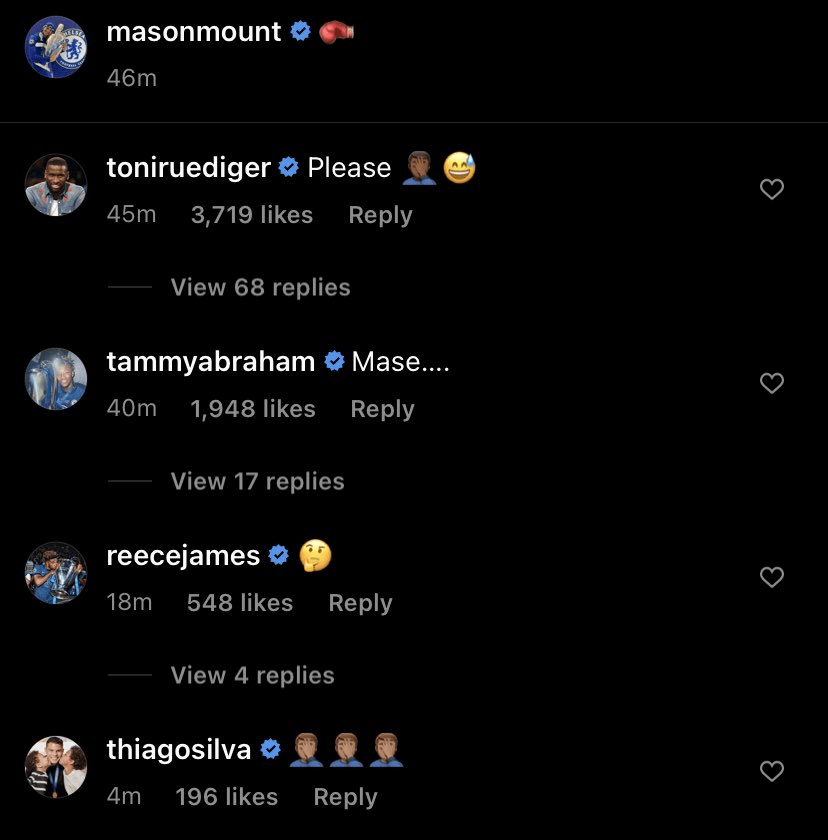 [마운트 인스타에 달린 첼시 동료들 반응ㅋㅋㅋ.jpg]