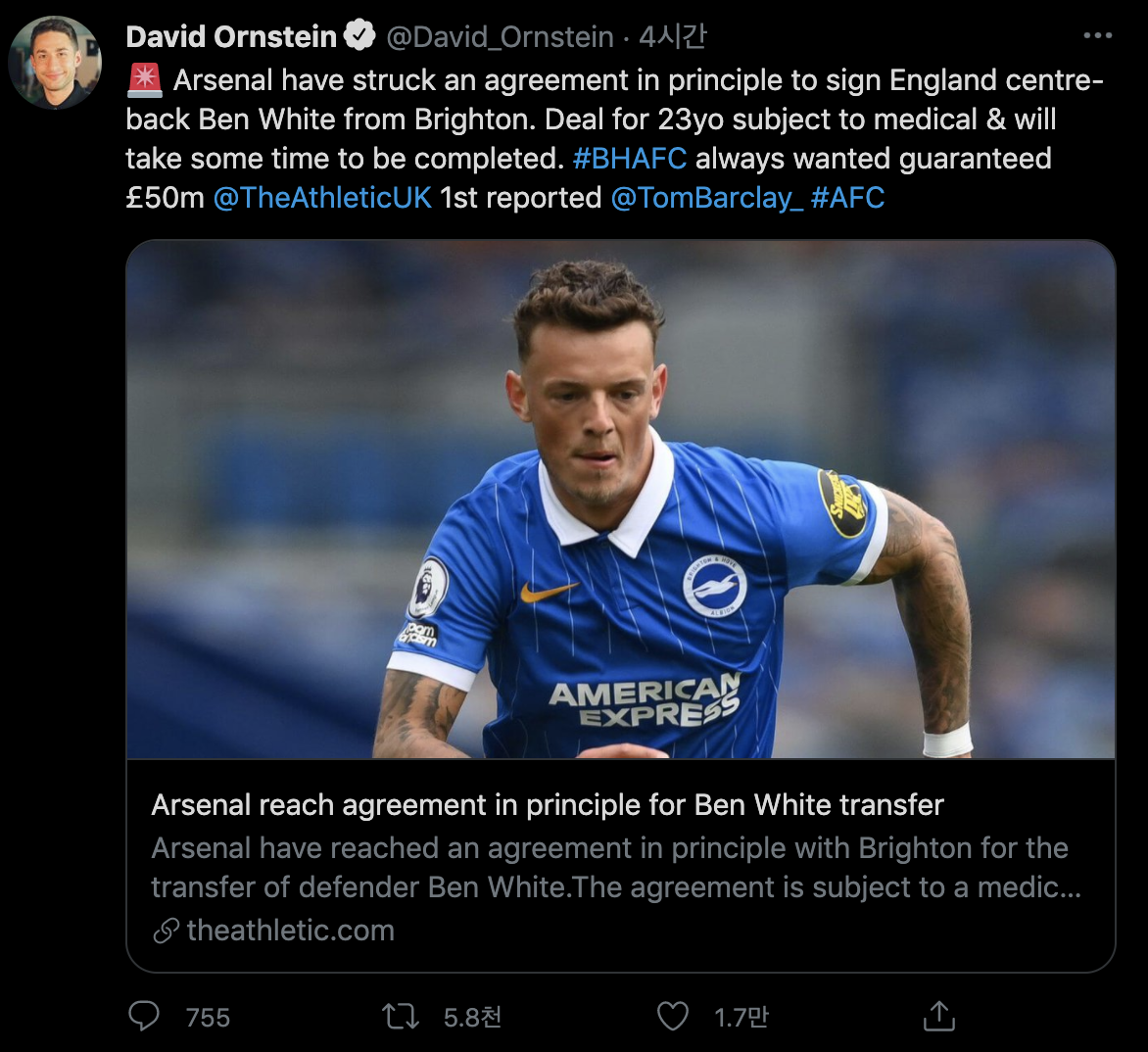 [[데이비드 온스테인] 아스날, 벤 화이트 영입 합의]