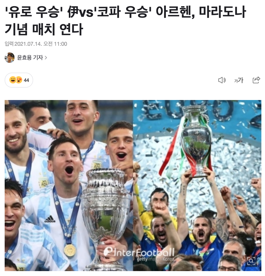 "유로 2020 우승팀과 코파 아메리카 우승 팀이 나폴리에 위치한 디에고 아르만도 마라도나 스타디움에서 맞붙을 수 있습니다 두 우승팀은 마라도나와 연관이 되어있는데요, 아르헨티나는 마라도나의 국가, 이탈리아는 마라도나의 축구 전성기를 보낸 곳입니다. UEFA와 남미축구연맹은 이번 기회에 마라도나 기념 경기를 열기로 뜻을 함께했습니다. 대회 개최가 유력하고 일정을 조율하고 있는 상황이고 매체에 따르면 오는 12월 혹은 1월 중으로 날짜가 잡힐 것으로 예상된다고 합니다.