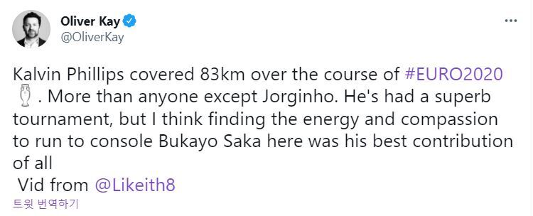 "칼빈 필립스는 이번 유로 2020대회에서 83KM를 뛰었으며, 이는 조르지뉴를 제외하고는 가장 많은 거리를 뛴 수치이다."